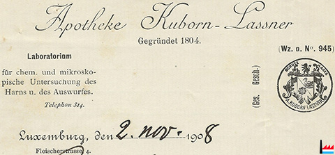 ![]() Apotheke Kuborn-Lassner, Fleischerstrasse 4, Luxemburg - Gegründet 1804 (Briefpapier: Luxemburg, den 2. nov. 1908; Collection famille Aschman-Bodson) Laboratorium für chem. und mikroskopische Untersuchungen des Harns u. des Auswurfes. Telephon 314