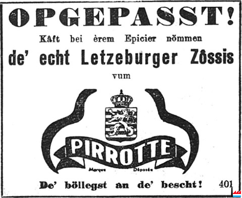 | 2.1940 | Décès de Clément Pirrotte, à l'âge de 63 ans, maître boucher, époux die Anne Fretz, Luxembourg, 47 rue de Strasbourg Mit dem Tode des bekannten hiesigen Metzgermeisters Clement Pirrotte der nach langer Krankheit verschieden ist, geht einer der bekanntesten Metzgermeister des Landes dahin, der in Zusammenarbeit mit seinen Söhnen das bekannte Geschäft am Straßburgerplatz, sowie 2 Filialen in Alt-Hollerich und auf dem Bahnhof zu hoher Blüte brachte. Die Pirrotteschen Produkte sind landbekannt. (t: 12.2.1940) |