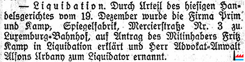 | 19.12.1920 | ![]() Spiegelfabrik Prim und Kamp, Rue Mercier 3, Luxembourg-gare Fritz Kamp - Liquidation 19.12.1920 (LW: 28.12.1920) |