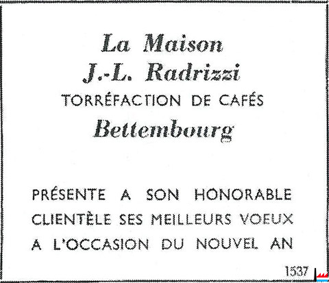 | 1962 | Maison Radrizzi Jean Louis - Torréfaction de café 106 route de Mondorf Bettembourg Tél: 51218 |