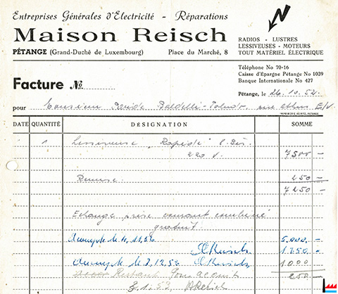 | 1952 | ![]() Maison Reisch, Pétange, 8 place du Marché, tél: 7016 - facture du 26.10.1952 (Collection industrie.lu) Entreprises Générales d'Electricité - Réparations |
