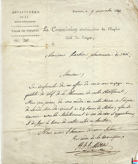 | 15.10.1829 | LA COMMISSION MÉDICALE de la Province de Limbourg, ayant examiné le Sieur Lambert Herman Renkin, demeurant à Tongres, Province de Limbourg comme candidat en l’art Pharmaceutique lequel ayant donné des preuves très satisfaisantesde ses connaissances et de son aptitude pour être admis comme Pharmacien de Campagne. |