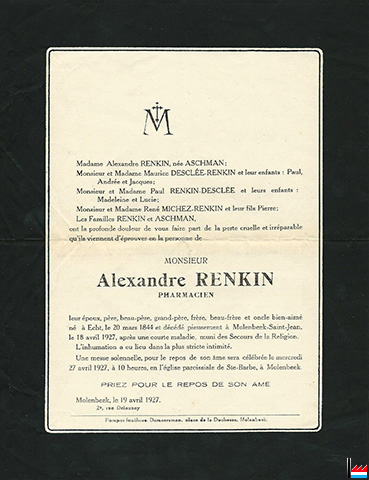 ![]() Alexandre Renkin - Pharmacien, † à Molenbeek-Saint-Jean, le 18 avril 1927. - Collection famille Aschman-Bodson, Luxembourg |