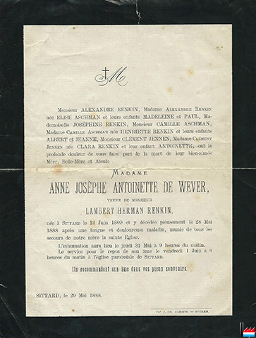 | 28.5.1888 | ![]() Madame Anne Josèphe Antoinette de Wever, veuve de Monsieur Lambert Herman Renkin, † 28.5.1888 à Sittard.- Collection famille Aschman-Bodson, Luxembourg. |