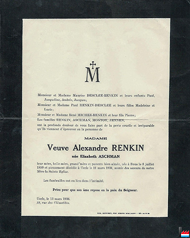 | 1936 | ![]() Veuve Alexandre Renkin, née Élisabeth Aschman, † à Uccle, le 11 mars 1936. - Collection famille Aschman-Bodson, Luxembourg. |