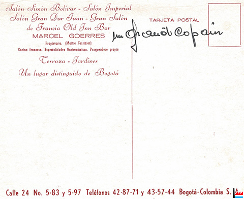 | 4.1951? - >=1976 | Restaurante Gran Vatel, Bogota, calle 24 con Sexta (<=1968: 5-83) (<=1973: 5-97), casa de residencia del doctor Alfonso López Pumarejo Marcel Goerres |