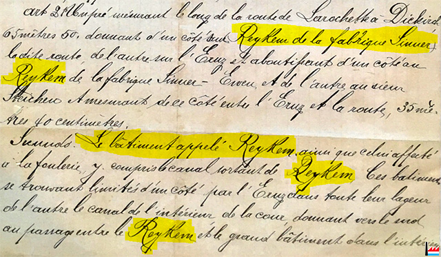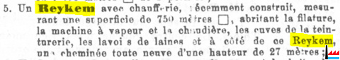 | 1876 | ![]() Reykem de la fabrique Sinner. ... Le bâtiment appelé Reykem (ou Reythem) - Acte de 1876 (Collection: Pol Ewen) |