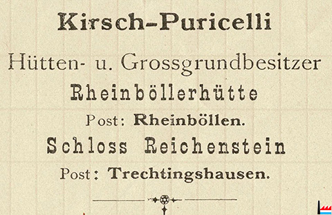 | 1899-1936 | Nicolas Kirsch - Puricelli, * 3.12.1866 in Dippach, + 8.10.1936, Hütteningenieur, baute mit seiner Frau Olga Puricelli, der Alleinerbin der Rheinböller Hütte, zwischen 1899 und 1902 Burg Reichenstein in ihrer heutigen Form auf und aus. |