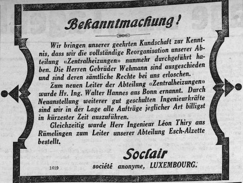 Les Maisons Wegener-Thiry succ. G. Wilmes Confiserie en Gros et Mme N. Wegener. Cuir et Crépins à Esch/Alzette 44, rue du Brill. informent leur honorable clientèle, que les bureaux et magasins resteront fermés du 1er au 25 juillet incl. |