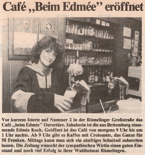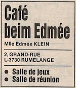 Café „Beim Edmée“ eröffnet. Vor kurzem feierte auf Nummer 2 in der Rümelinger Großstraße das Café „beim Edmée“ Ouvertüre. Inhaberin ist die aus Bettemburg stammende Edmée Koch. Geöffnet ist das Café von morgens 9 Uhr bis um 1 Uhr nachts. Ab 9 Uhr gibt es Kaffee mit Croissants, das Ganze für 50 Franken. Mittags kann man sich ein zünftiges Schnitzel zubereiten lassen. Die Zeitung wünscht der sympathischen Wirtin einen guten Einstand und noch viel Erfolg im ihrer Wahlheimat Rümelingen. |