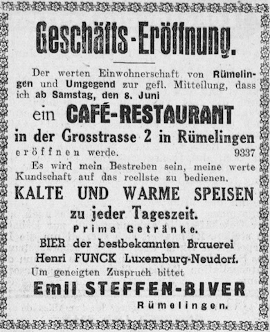 Falsche Angabe der Adresse !!! In den folgenden Artikeln und Aufzeichnungen wird für dieses Café stets die Adresse „Bahnhofstrasse , rue de la Gare“ angegeben. Es muss hier jedoch heißen „Grand-rue“, da um diese Zeit die rue de la Gare bereits den Namen rue des Martyrs trägt. Im Artikel „Signification de Jugement.“ im LW 12.1.1977 wird die Adresse mit Grand-rue angegeben. |