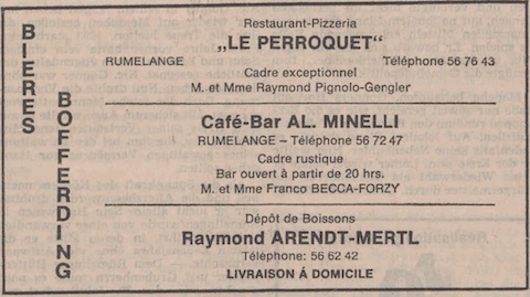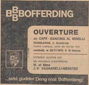Rümelingen. Geschäftsübernahme. Am vergangenene Donnerstag hatte die Familie Franco Becca-Forzy zur Wiedereröffnung des bekannten Café-Dancing „Al-Minelli“ auf Nr. 4 in der Großstraße eingeladen. …… |