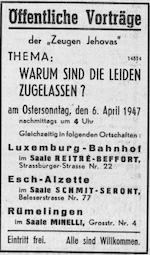 | LCGB Sektion Rümelingen. Unsere Sektion organisiert am nächsten Sonntag, dem 25. Mai, um 4 Uhr nachmittags eine Aufklärungsversammlung im Saale Vagnarelli-Menster, Großstraße (beim Bahnhof), für sämtliche portugiesischen Gastarbeiter aus dem Kayltal. Referent ist Gewerkschaftssekretär Maduro, der über aktuelle Sozialprobleme spricht. Nic. Scheitler, Präsident. |