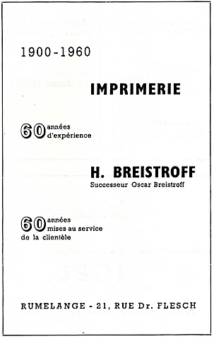 | Die Besitzer der Druckerei: 1900 <-1922 Henri Breistroff (Imprimerie, atelier de reliure, librairie, papeterie, confiserie) <- 1922 - Henri Breistroff-Neyers et Consorts <- 1955 - 1975 Oscar Breistroff |