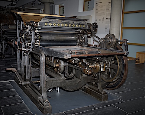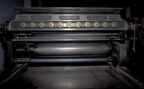 ![]() ![]() ![]() ![]() ![]() ![]() Accidenz No 5 Stopp- oder Haltzzylinderpresse System Eisenbahnbewegung Erfinder: Friedrich Gottlob Koenig (1774-1833) Hersteller: Bohn & Herber, Würzburg (D) Baujahr: 1900 Leistung : 700 Druckbögen pro Stunde Druckformat: 64 x 42 cm max. Über die flache Druckform läuft ein Zylinder, der den Papierbogen über die Druckform abrollt. Nach dem Druckvorgang stoppt der Zylinder und der einseitig bedruckte Bogen wird in die fadenbespannte Auslage gelegt. Der Antrieb erfolgt hier über Handkurbel oder Fußpedal. Die Accidenz No 5 hat ein Farbwerk mit Farbkasten und zwei Auftragswalzen. Papieranlegung von Hand. |