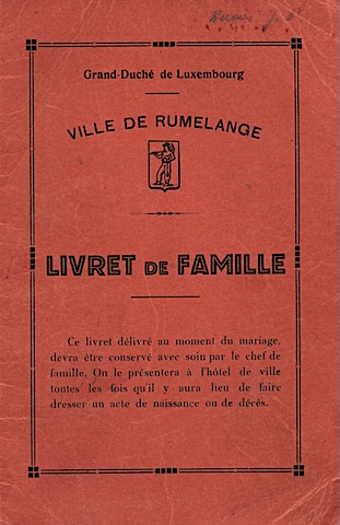 | 1938 | Familienbuch, Livret de Famille Ville de Rumelange. Dieses Exemplar wurde im Jahr 1938 ausgestellt. Vorderseite Rückseite |