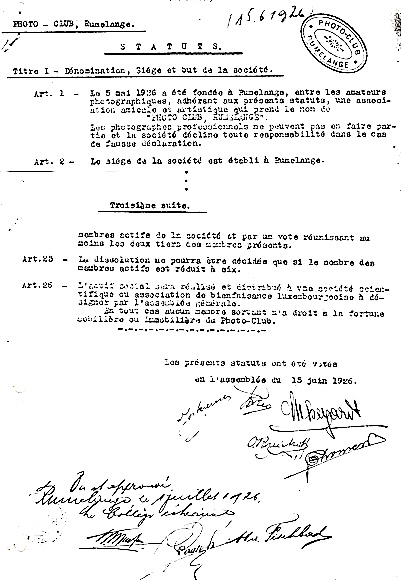 | Am 15 Juni 1926 wurde in Rümelingen ein Photoclub gegründet. Bereits 1918 wurde im Café Wolff-Pallien ein Photoclub aus der Taufe gehoben. Wie lange dieser bestand und op die Gründungsväter des im Jahre 1926 gegründeten Photoclubs hiervon Kenntniss hatten kann heute nicht mehr festgestellt werden. Die Gründungsväter des „zweiten Rümelinger Photoclubs“ sind der Nachwelt jedoch erhalten geblieben. Hier finden wir unteranderem auch den Namen O.Breistroff. ![]() Das originale Dokument befand sich zur Zeit der Anfertigung dieser Copie im Besitz von Herrn Fernand Lorang, Rümelingen. |