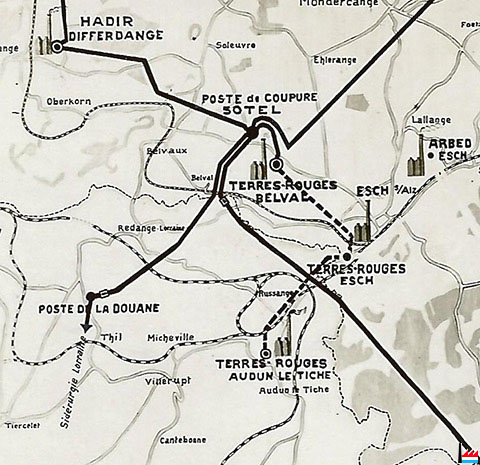 Détail du réseau SOTEL: HADIR Differdange - Terres Rouges BELVAL - Terres Rouges Esch - Terres Rouges Audun-le-Tiche - ARBED Esch (non reliée) -