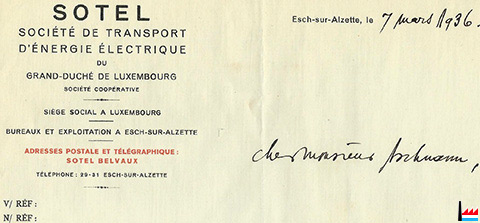 SOTEL - Société de transport d'énergie électrique du Grand-Duché de Luxembourg - Société coopérative - Esch/Alzette - 7.3.1936 - Papier à lettre à entête - Archives Camille Aschman Jr. - Collection famille Aschman-Bodson.