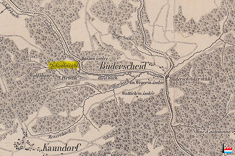 | 1862 | ![]() Schaulsmillen - Schaulsmühle - Schaulsmuhl, Kaundorf (Carte Jean-Baptiste Liesch - 1862) Wolfsbour ![]() Schaulsmuhl, Kaundorf - Buderscheidermuhl, Buderscheid - Mine d'Antimoine, Goesdorf (Carte Jean-Baptiste Liesch - 1862) |