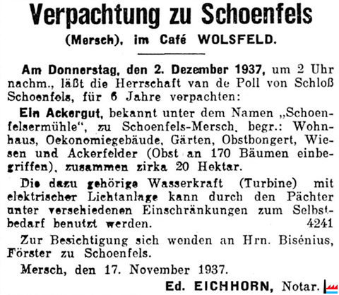 | 1932 | Schönfels (Mersch). 28. Okt. In öffentlicher Verpachtung ließ gestern Dame Jonkheer Maximilian van de Poll von Schloß Schönfels, ein daselbst gelegenes Ackergut, bekannt unter dem Namen „Schönfelsermühle", begreifend Wohnhaus mit Oekonomiegebäuden, Gärten, Obstbongert, Wiesen und Ackerfelder, zusammen zirka 20 Hektar, auf ein Ziel von 6 Jahren verpachten. Pächter ist Herr Joseph Wolmering, Landwirt und Brennereibesitzer aus Gosseldingen, zum jährlichen Preise von 6.800 Franken. (LW: 28.10.1932) |