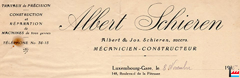 | <=1935 | ![]() Albert Schieren Albert & Jos Schieren, succrs. Mécancien - constructeur 148 Boulevard de la Pétrusse, Luxembourg-gare Tél: 3615 |