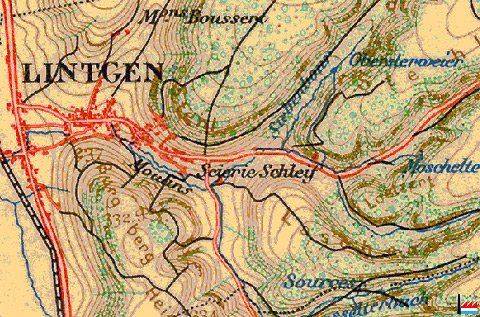 Lintgen: Moulins (Bannmillen, Cartonnerie) - Scierie Schleif © Origine Administration du Cadastre et de la Topographie Luxembourg (ACT) - Extrait de la carte topographique à l'échelle 1: 50.000 édition 1927 - Autorisation de publication du 20.10.2010.»