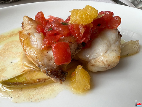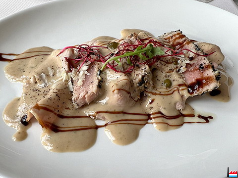Restaurant Schloss Monaise: Vitello Tonnato mit frischem Thunfisch; Seeteufel, Zitrusfrüchte, Zitronenvinaigrette;