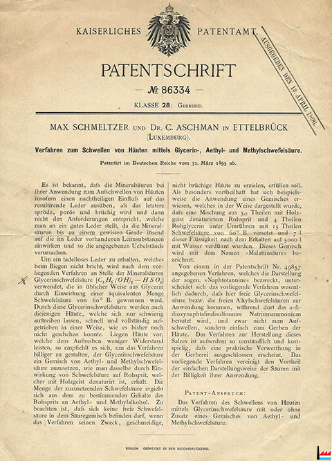 | 1896 | Brevet d'invention N° 2467 - Max. Schmeltzer, à Wiltz, et C. Aschman, à Ettelbruck. Verfahren zum Schwellen von Häuten mittels Glycerin- Asthyl- und MethylschwefelsäureProcédé pour la production et l'emploi d'un mélange contenant les acides Methyl-Ethol-Glycero et Gluco sulfurique, - 16 mars 1896. (Mémorial A n°59 du 30.09.1896) |