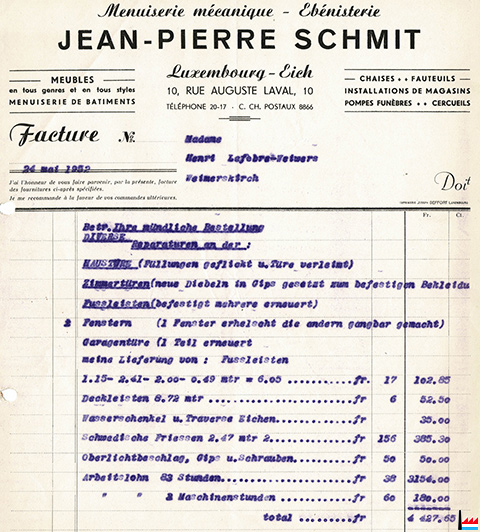 | <=1942 | Möbel- und Bauschreinerei Schmit Jean-Pierre, Eich, 10 rue Aug. Laval |