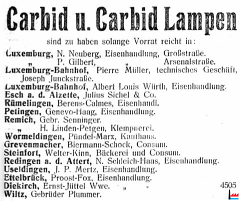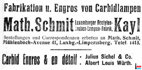| 1914 | Math. Schmit, Azetylen-Grubenlampen-Fabrik, Kayl Azetylen-Grubenlampen-Fabrik Inhaber: Mathias Schmit, Industrielle, Luxemburg - Limpertsberg (Inscription au registre aux firmes N° 1683 - Du 26 janvier 1914) |