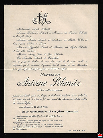 | 19.5.1866 | Mariage à Luxembourg d’Anton (Antoine) Schmitz (* 19.1.1835 à Bockenheim), serrurier, avec Henriette Larschfeld (* 22.6.1845 à Luxembourg). |