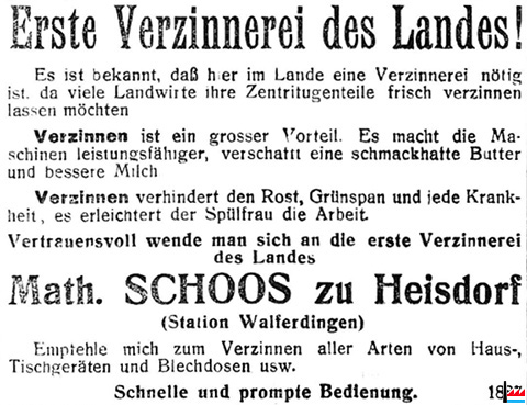| 1919 | ![]() Schoos Mathias, Heisdorf - Erste Verzinnerei des Landes (LW: 3.10.1919) |