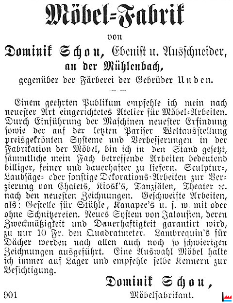 | 1868 | Möbelfabrik Dominik Schou, Mühlenbach |