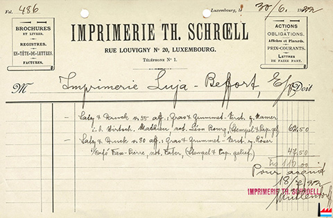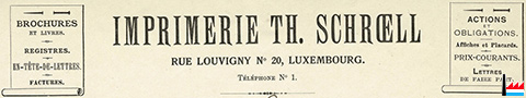 | 30.6.1922 | ![]() Imprimerie Th. Schroell, Luxembourg, 20 rue Louvigny, tél. 1 - facture du 30.6.1922 (Collection industrie.lu) |