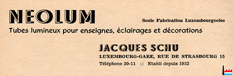 | 1948/49 | NEOLUM - Enseignes lumineuses Schu Jacques 20 rue de Strasbourg, Luxembourg (15 rue de Strasbourg, Luxembourg -> Hotel Lido)Tél. 3011 |
