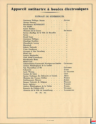 bouées électroniques antitartre pour Antitartre s.àr.l., Luxembourg (Loesch Robert) Tél. 29706 Brevet d'invention N° 392110 de Richard Hartley Smith ABBOTT - Perfectionnements relatifs au traitement de l'eau - 7.11.1931 Angleterre |
