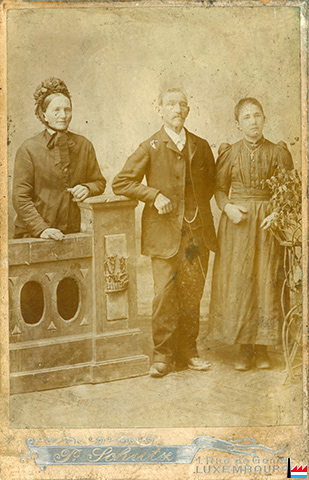 Op där Foto si wahrscheinlech meng Ururgrousselteren (Säit vu menger Mamm). Gebuer 1831 an 1839, bestued 25.10.1866 zu Hostert/Niederanven. D’Kand op der Foto misst eent vun hiren Meedercher sinn, 1868 gebuer (si haten 8 Kanner, dovun drei Meedercher). Ech schätzen den Alter vun deem Kand op 12-15 Joër. D’Foto misst also an de fréien 1880er Joren gemaach gi sinn. (2022: Marc Wirtor)