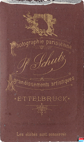 Pierre Schütz (* 6.8.1854 à Ettelbruck ; † 29.4.1897 à Luxembourg, 3, rue du Génie), photographe, époux de Maria Koch. |