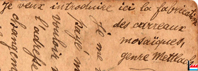 | Fin 1.1896 | Aloys Schuler, Ingenieur, à Kawenczyn (de nos jours Kaweczyn), près de Varsovie (Russie): "Je veux introduire ici la fabrication des carreaux mosaïques, genre Mettlach"