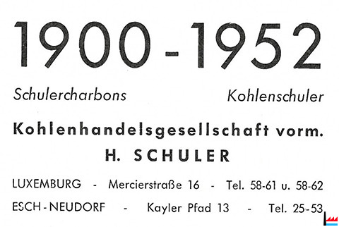 | <=1942 | Schuler A.G. Kohlenhandelsgesellschaft Kayler Pfad, Esch Tél: 2553 |