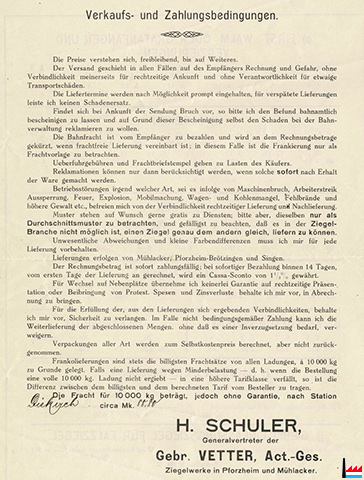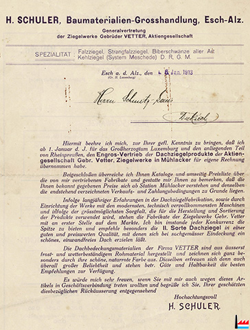 | 1.1.1913 - ? | ![]() H. Schuler, Generalvertreter der Gebrüder VETTER AG, Ziegelwerke in Pforzheim und Mühlacker - 1.1.1913 - ? - an Schmitz-Laeis, Diekirch (Collection: industrie.lu) Spezialität: Falzziegel, Strangfalzziegel, Biberschwänze aller Art, Turmbiberschwänze, Kehlziegel (System Meschede) D.R.G.M. |