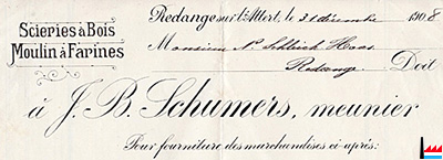 | 1908 | ![]() Moulin à Farine - scieries à bois J.-B. Schumers, Meunier; Redange/Attert - 1908 (Collection: industrie.lu) |