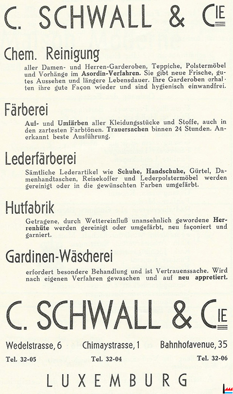 | <=1918 | C. Schwall & Cie Chemische Wäscherei und Färberei 6 Wedelstraße, Luxemburg-Bahnhof |
