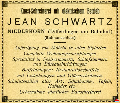 Kunst-Schreinerei mit elektrischem Betrieb Jean Schwartz, Niederkorn (Differdingen am Bahnhof - Bahnanschluss) Pub - Werbung - 1918