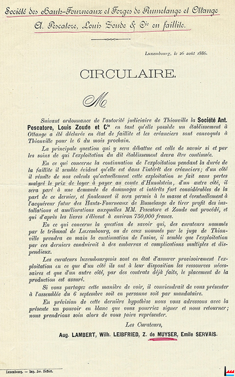 | 26.8.1886 | ![]() Société des Hauts-Fourneaux et Forges de Rumelange et Ottange A. Pescatore, Louis Zoude & Cie en faillite. Luxembourg, le 26 août 1886. CIRCULAIRE. Suivant ordonnance de l’autorité judiciaire de Thionville la Société Ant. Pescatore, Louis Zoude et Cie en tant qu’elle possède un établissement à Ottange a été déclarée en état de faillite et les créanciers sont convoqués à Thionville pour le 6 du mois prochain. (…). Les Curateurs, Aug. LAMBERT, Wilh. LEIBFRIED, Z. de MUYSER, Emile SERVAIS. Luxembourg. - Imp. Jos. Beffort. (Collection famille de Muyser-Huck, Luxembourg) |