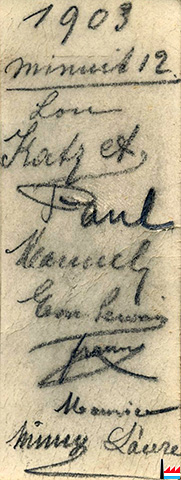 Lou = Louise Majerus, épouse de Emile Servais Katz = pourrait (logiquement) être Meisy Mongenast-Servais, fille de la précédente Paul Mongenast, son mari Manuel = Emmanuel Servais-Wolff, frère de Meisy Em. Servais = Emile Servais, époux de Louise et père de Meisy, Emmanuel, Maurice et Frantz Frantz Servais-Jacquinot, fils du précédent Maurice (= Maurice Lamort, mari de Laure Majerus (de préférence à Maurice Servais-Grechen, dit Seny, fils d'Emile, qui semble avoir été absent à cette réunion des familles Majerus et Servais). C'est la présence de son épouse et de sa fille qui me font plaider pour lui; (car Maurice Servais signe Seny) Mimy Lamort (future baronne Auguste Jacquinot), fille du précédent ; nièce de Louise Servais-Majerus Laure Lamort-Majerus, mère de la précédente J. Majerus = Joséphine Gebhardt, veuve de François Majerus, les deux ayant été les parents de Louise et Laure Majerus Drynes (?) (Info: Manou Servais) |