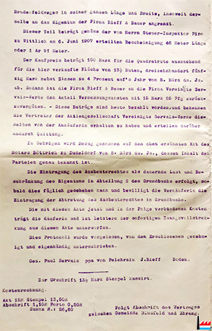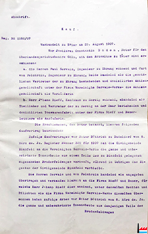 | 29.8.1907 | ![]() Kaufvertrag der Tonausbeute aus einem Teile des zu Binsfeld gelegenen sogenannten Bruderfeldweges in seiner ganzen Länge (46 m) und Breite, insoweit derselbe an das Eigentum der Firma Rieff & Bauer angrenzt, von den Vereinigten Servais Werke A.G. an die Firma Rieff & Bauer vom 8.3.1907: Kaufpreis bei 100 Mark / Quadratrute bei einer Fläche von 13,5 Ruten: 1350 Mark nebst Zinsen zu 4% / Jahr vom 8.3.1907. (Sammlung: Wilhelm Schommer) Er ist unterschrieben für die Vereinigten Servais Werke A.G.: Paul Servais, Ingenieur zu Ehrang, und Curt von Pelchrzim, Ingenieur zu Ehrang und für die Firma Rieff & Bauer: Johann Rieff, Kaufmann zu Merzig |