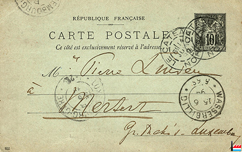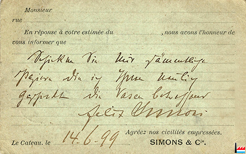 | 6.1899 | ![]() Félix Simons, Simons & Cie, Le Cateau à Pierre Linden, jardinier (du château Simons?), Mertert / Luxembourg (Carte postale: collection: industrie.lu) Schicken Sie Mir sämmtlige Papiere die ig Ihnen neulig geschickt die Vasen betreffend Envoyez-moi tous les documents que je vous ai récemment envoyés concernant les vases. |