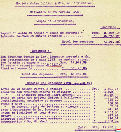 ![]() ![]() Société Jules Collart & Cie en liquidation - Situation au 28.2.1920 (Collection: Archives Servais) Répartition des titres Felten & Guilleaume Carlswerk Honoraires Hoffmann & Bettendorf Indemnité C.Clivio & Cie Loyer de la maison Pierre à Rodange |